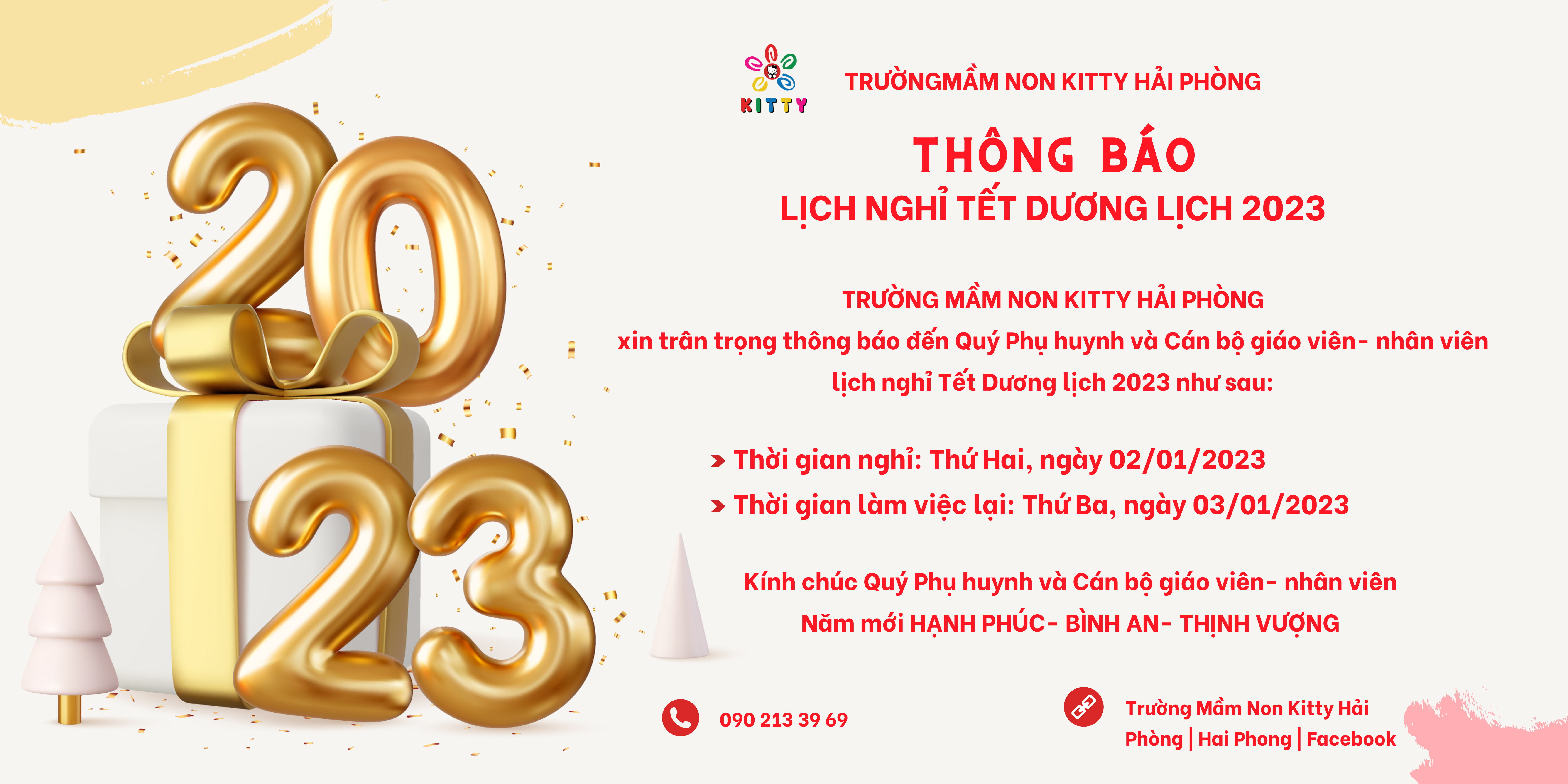 TRƯỜNG MẦM NON KITTY HẢI PHÒNG xin trân trọng thông báo đến Quý Phụ huynh và Cán bộ giáo viên- nhân viên lịch nghỉ Tết Dương lịch 2023 như sau: